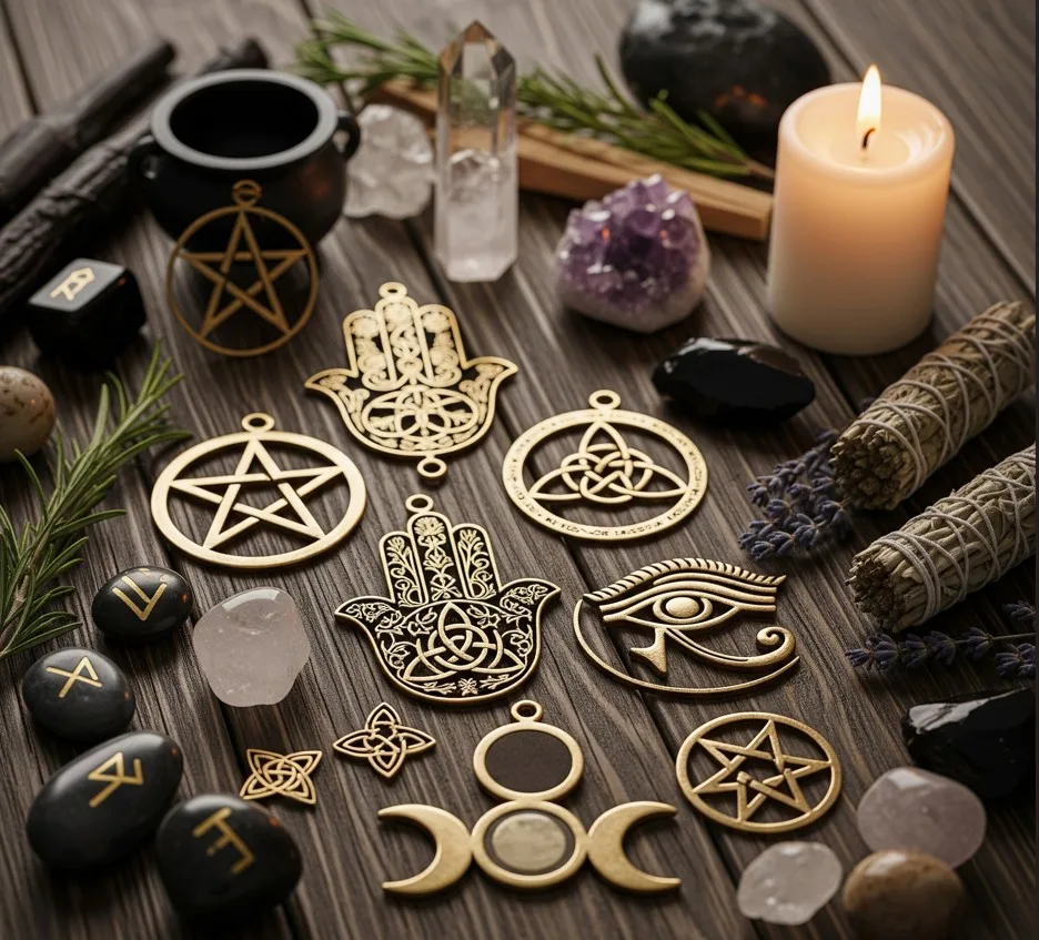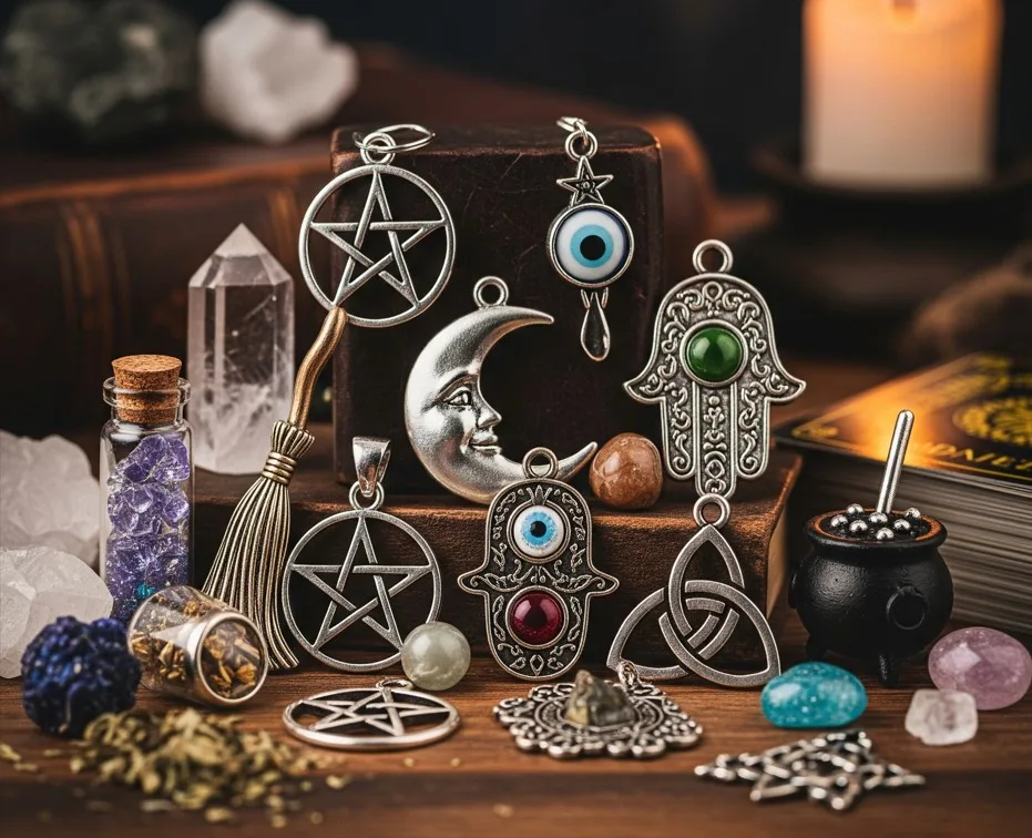 Wiccans often channel symbolism into charms and amulets. A charm’s power comes from the symbols engraved or attached to it – in other words, charm symbols and their meanings guide its magic. For example, carving a pentacle on a wooden disk creates a protective amulet. Similarly, a lover might add a heart charm and pink or red ribbons to a sachet to attract affection. Even the color of a cord or crystal in a charm bag carries meaning (green beads for growth, black cord for protection, etc.). Every element of a charm is chosen to amplify intent.