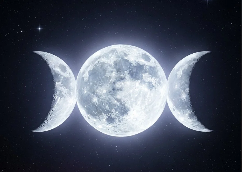 Another signature Wiccan image is the triple moon. This Wiccan moon symbol shows a waxing crescent, a full moon, and a waning crescent in a row. It is also called the Triple Goddess symbol and a strong witch symbol. As ThoughtCo explains, the triple moon “represents the three phases of the moon — waxing, full, and waning”. By extension, it embodies the Goddess in her three aspects: Maiden (waxing = new beginnings), Mother (full = fertility and peak power), and Crone (waning = wisdom and release). Each phase aligns with certain magics: new projects on the waxing moon, the most potent magic at the full moon, and banishing/letting go on the waning. This illustrates the triple moon pentacle meaning: together, these crescents remind witches of the life cycle and the feminine divine. Wiccans often wear a triple moon pendant or carve it on altars to call upon those energies.