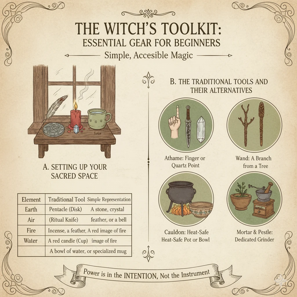 Four ritual tools—the chalice, athame, wand, and pentacle—were adopted into modern traditions like Wicca from medieval ceremonial magic sources. However, every tool has a simple, accessible alternative, which is excellent news for anyone trying to learn how to be a witch in real life without a major financial investment.
